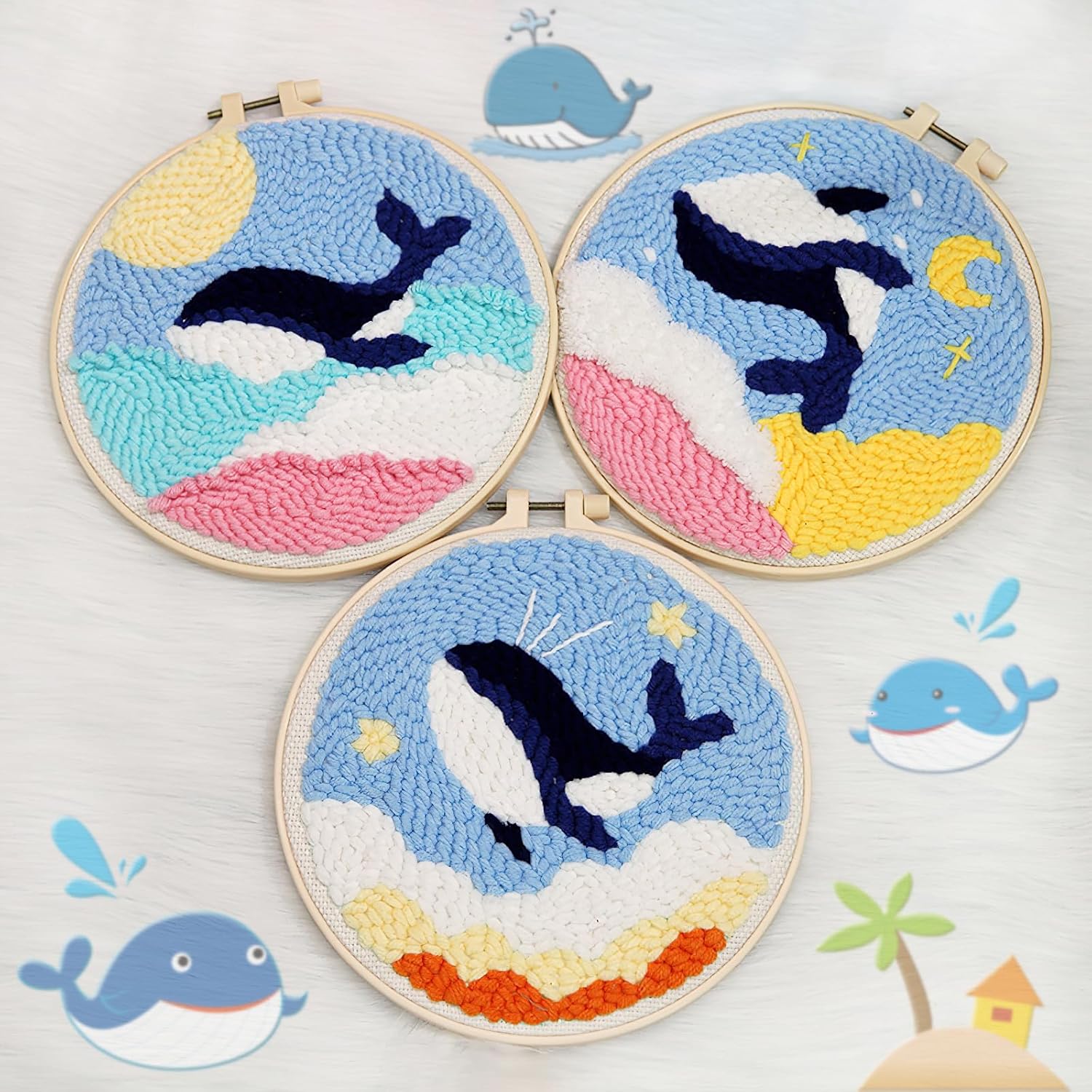 3 Pack Punch Needle Embroidery Kit for Beginners, Rug Hooking Starter Kit with Whale Pattern Stamped Cloth 3 Embroidery Hoops Woolen and Punch Needle
