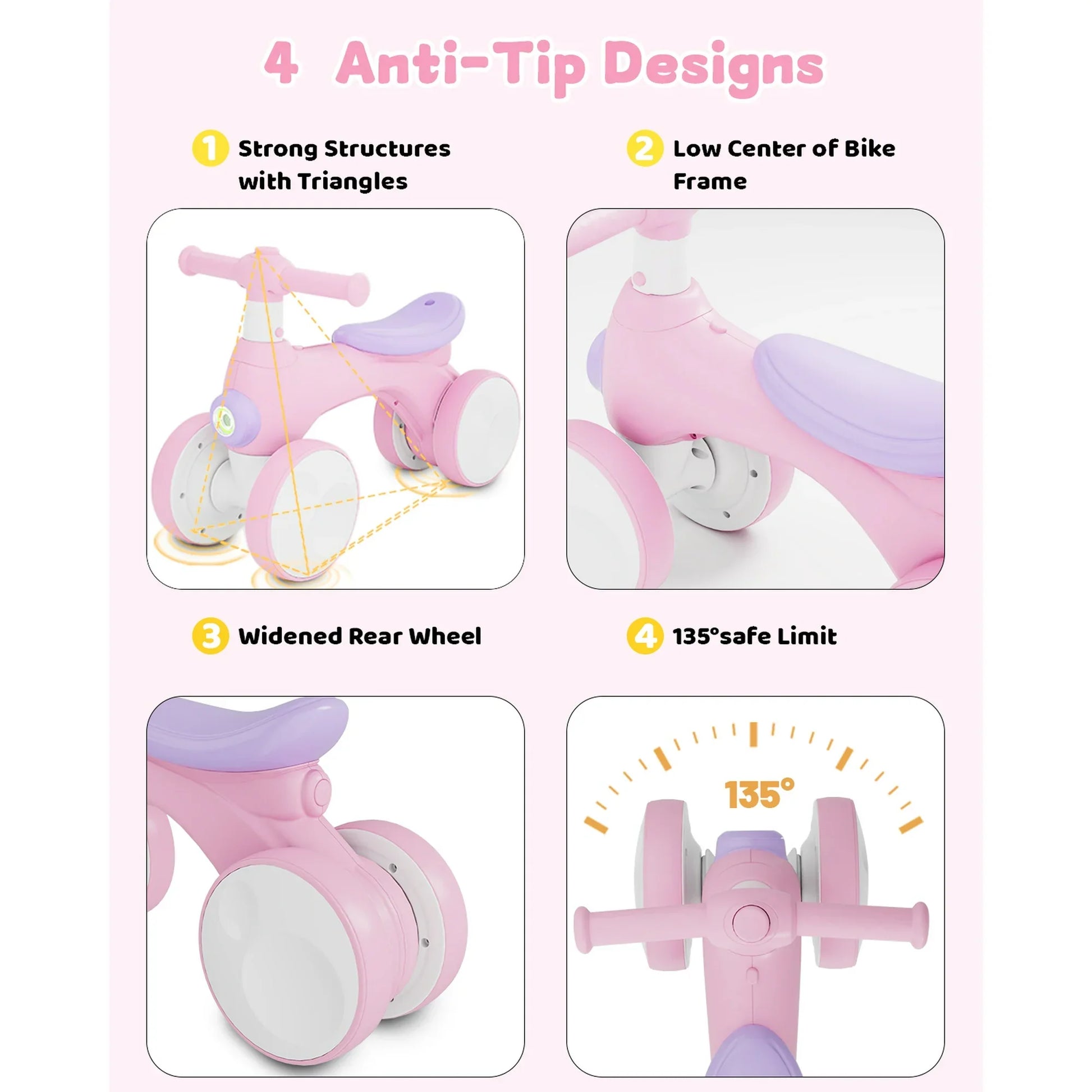 Baby Balance Bike for 1-2 Year Old Boys Girls, 4 Wheels Balance Bike with Lights & Sounds, Best Birthday Gift for Toddler, Toys for Baby Walker(Pink)