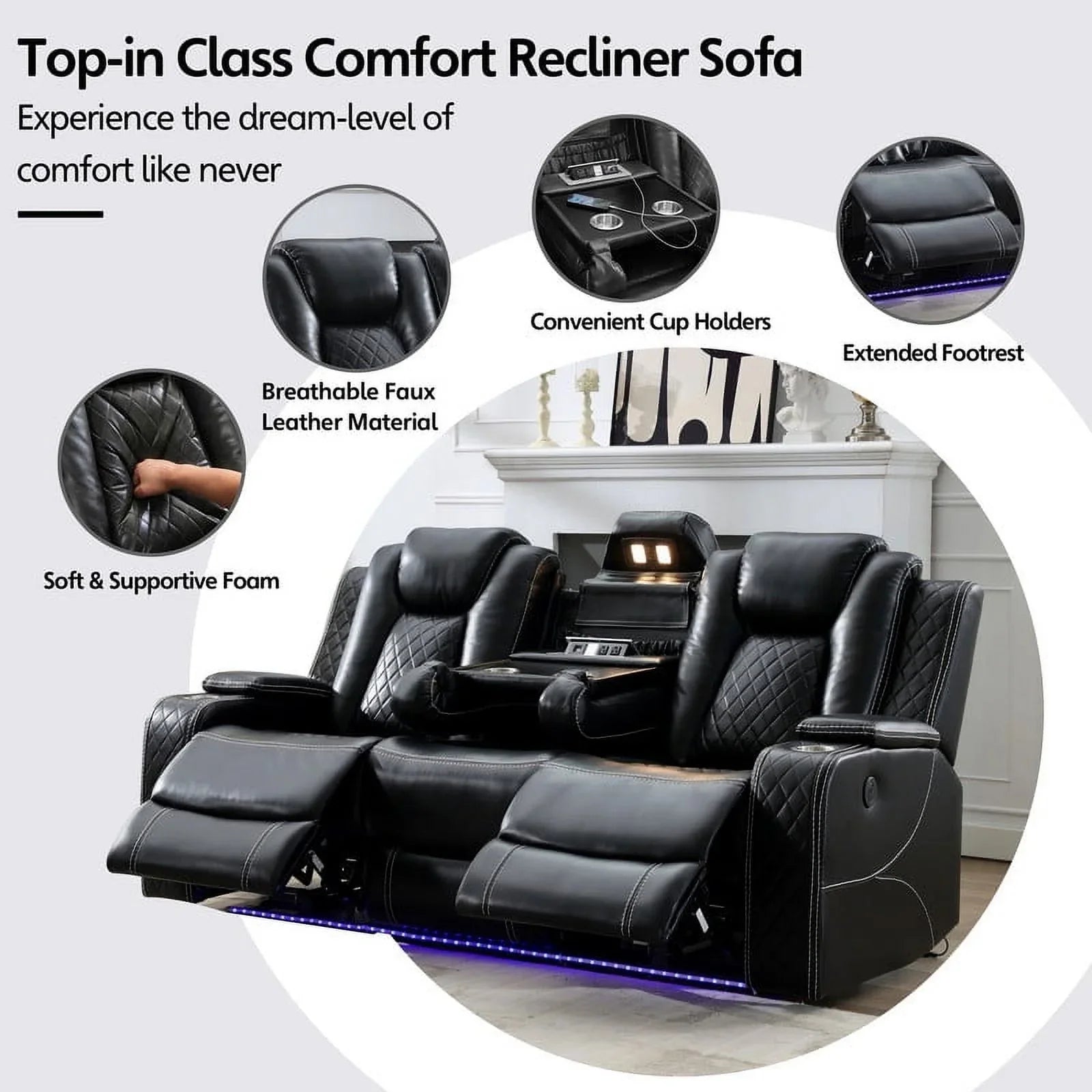 Comfort Stretch 5 Seats Power Recliner Sofa Sets with Speaker,Black Faux Leather Reclining Sectional Couch for Living Room Furniture Sets with USB Port,Storage Console,Cup Holders,LED Lights