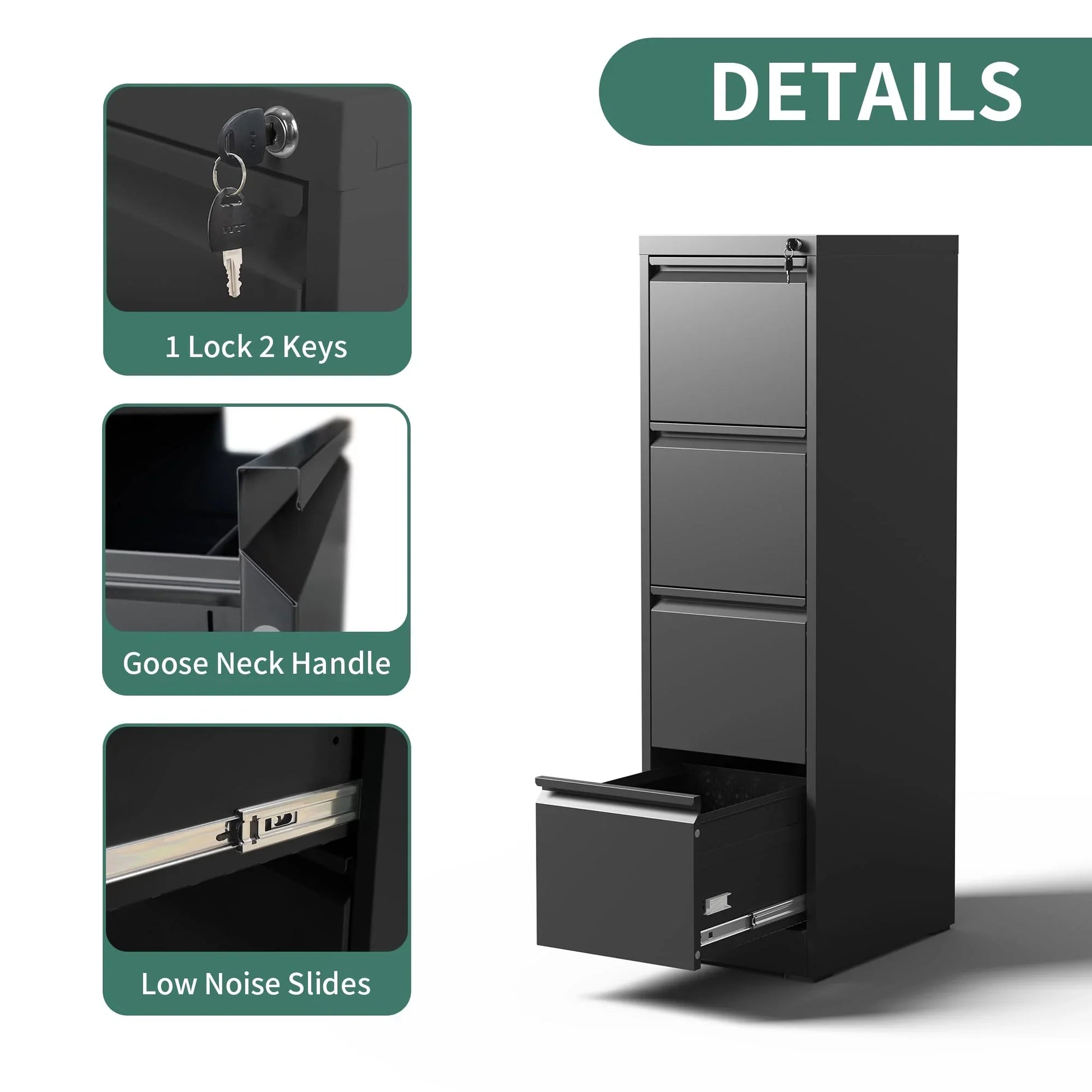 IKIMI 4 Drawer File Cabinet,Metal Filing Cabinets with Lock,Black Vertical File Cabinet for Home Office,Heavy Duty Metal Storage Cabinet for A4/Letter/Legal Size File