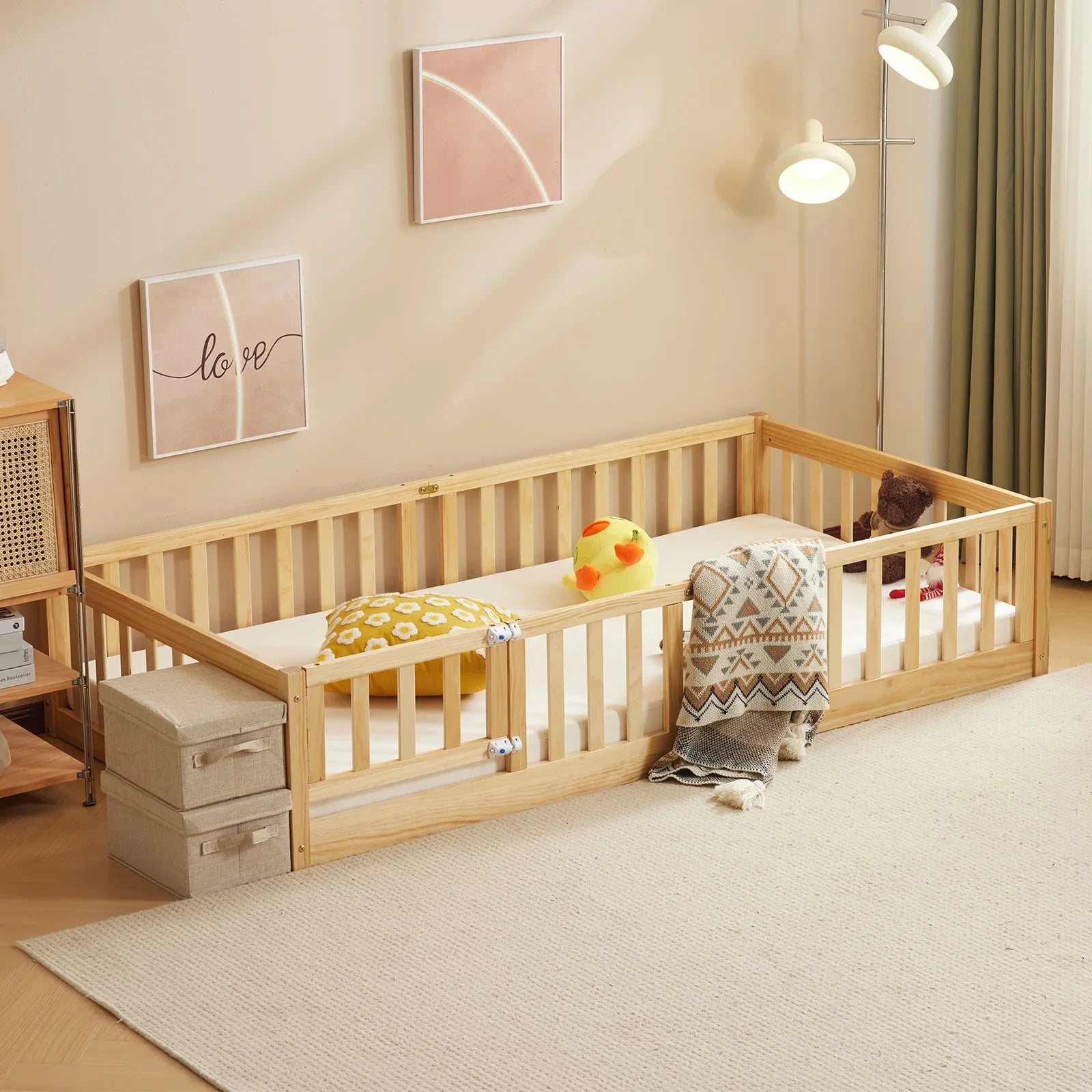 Ktaxon Montessori Twin Floor Bed with Safety Guardrails, Toddler Bed Frame for Kids, Wood Frame - Nature