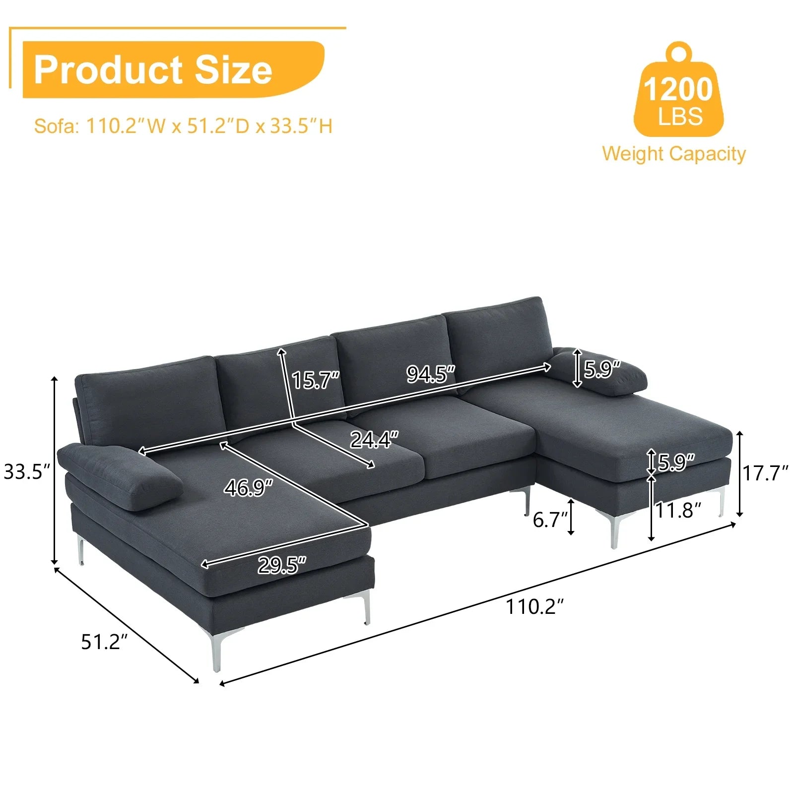 Ktaxon Sectional Sofa, U-Shape Convertible Couch Set with Soft Linen Fabric, Lounge Sleeper with Chaise for Living Room 4 Seat Dark Gray
