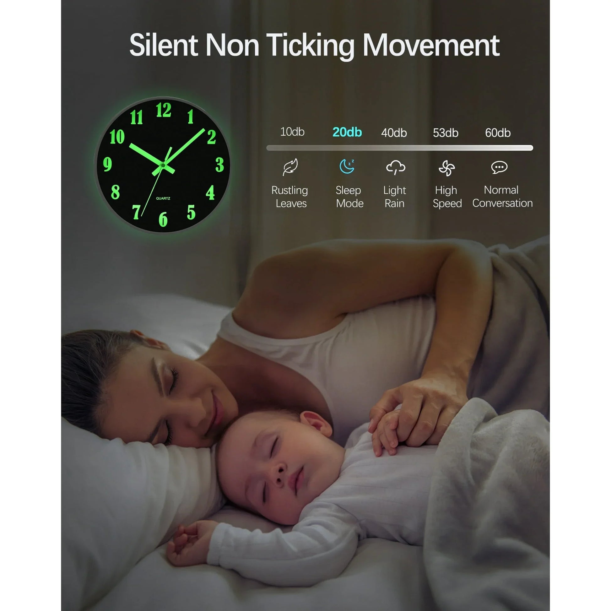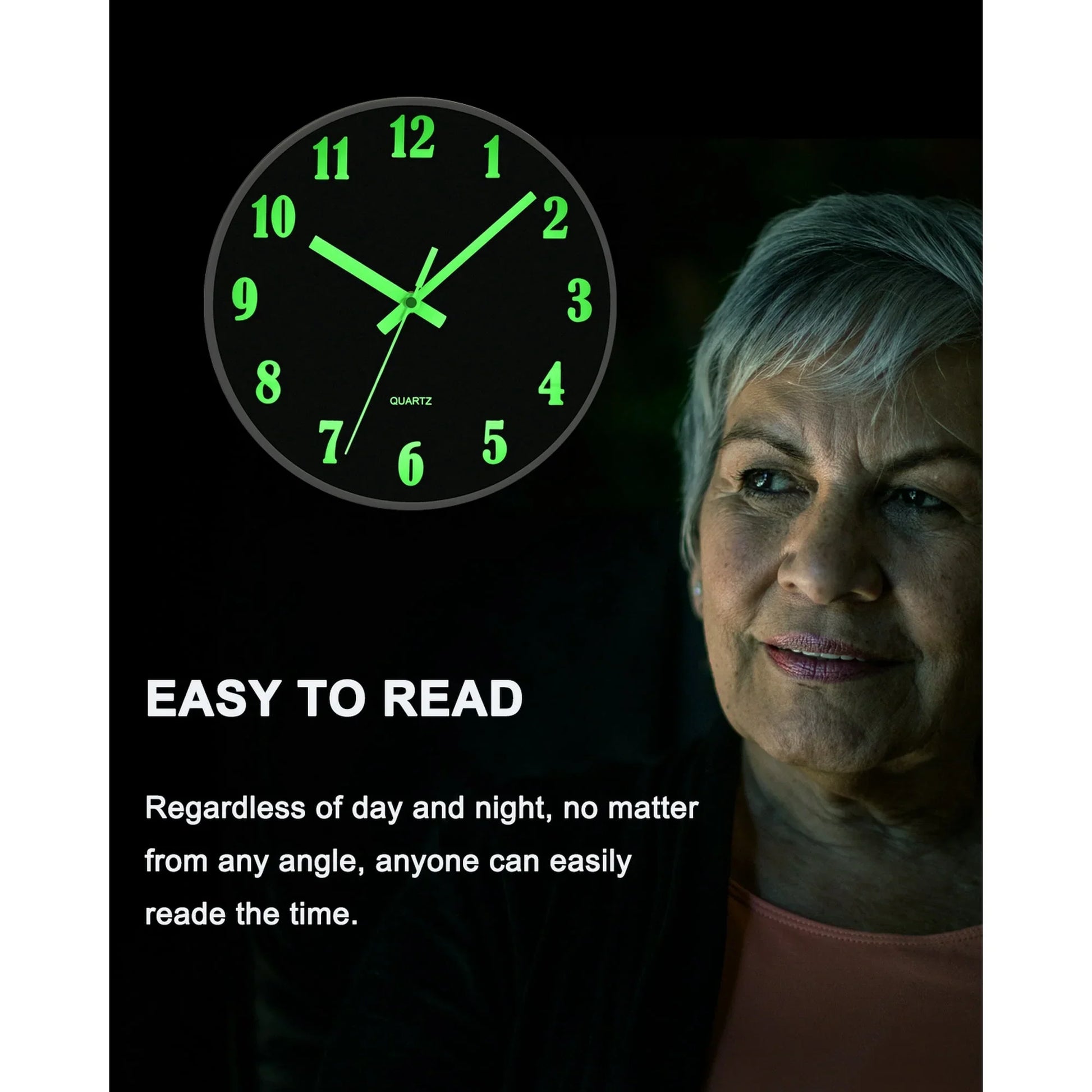 QKURT Modern Night Light Wall Clock, 10 Inch Silent Non-Ticking Quartz Wall Clocks, Glow in The Dark Battery Operated Decorative Wall Clock for Bedroom, Kitchen, Living Room
